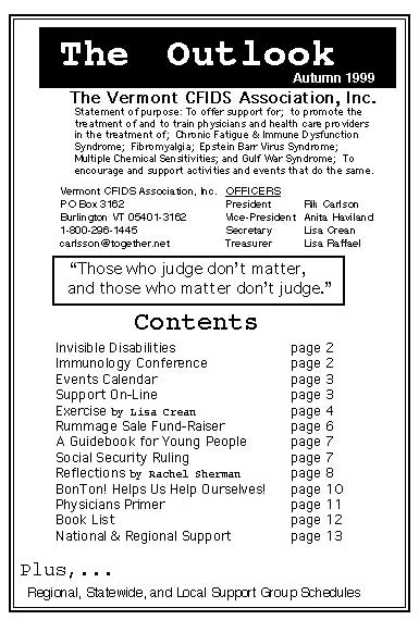 First Annual "We're Sick and Tired of Our Stuff" Rummage SaleWe need your help in turning trash to cash! We won't be doing the Christmas doll house raffle this year, so we're trying our hand at other fundraising ideas. "We're Sick and Tired of our Stuff" is the theme for a rummage sale on Friday and Saturday, 17 and 18 September, from 9am to 2pm each day. Mary Eckert has graciously offered her home at 14 Colbert Street in Essex Junction as the site. (Directions from Burlington: I-89N to Exit 15, right onto Route 15E, left on Susie Wilson Road, right on Blair Road, left on Colbert.) How you can help: 1) donate, 2) volunteer, 3) publicize, and 4) shop. First, bring donations of clean, salable items to the next support group meeting, Wednesday 15 September at 7pm. (No books, please, except for children's books.) If this time doesn't work for you, call Mary, Rik or Lisa to make other arrangements. Second, volunteer to help with set up Thursday afternoon, to sell Friday or Saturday, or to bake goodies to be sold. Third, tell all your friends, family and neighbors to attend the sale with wads of cash in hand. Fourth, come shop yourself! It will be fun! Please volunteer to help, even if only for an hour or two. The doll house raffle became unmanageable because the work burden fell on just a few people. We all have to budget our energy wisely, so help make the rummage sale work with whatever goods and time you can afford. Contacts: Mary 879-6215, Rik 1-800-296-1445, or Lisa 654-7784. COPING WITH CFIDS: A Guidebook By and For Young People with CFIDSThis booklet is written by four young people with CFIDS for young people who have recently been diagnosed with CFIDS. The authors remember feeling alone and afraid, confused and isolated when they first became ill. It was hard to understand what was happening and why, let alone try to explain it to others. By sharing their experiences they hope to offer a better understanding of what life with CFIDS is and can be. For copies of this new booklet, please send $1 per copy for postage and handling to: The CFIDS Association of America, Attn: Coping with CFIDS, PO Box 220398, Charlotte, NC 28222-0398. Social Security Signs New CFIDS RulingOn April 30, 1999, the Social Security Administration (SSA) issued a ruling clarifying that persons with medically documented CFIDScan be found to have a "medically determinable impairment." The ruling provides guidance to disability claims processors for applying SSA policy to applications for SSDI benefits that result from disability due to CFIDS. While the new ruling will hardly "open the f;loodgates" for CFIDS patients to garner disability benefits, it should make it easier for disabled CFIDS patients to acquire benefits at an earlier stage in the SSA appeals process. Overall the new Social Security Ruling should improve disabled CFIDS patients' outcomes in the SSDI process. It is binding on adjudicators at all levels -- initial application, reconsideration, and administrative law hearings -- and it applies when SSDI recipients are periodically reviewed (for Continuing Disability Reviews or CDRs). The document, "Social Security Ruling, SSR 99-2p.; Titles II and XVI: Evaluating Cases Involving Chronic Fatigue Syndrome (CFS)" should become a critical reference in any CFIDS patients application for federal disability benefits. This document is available by calling or writing the Vermont CFIDS Association, PO Box 3162, Burlington VT 05401-3162, 1-800-296-1445.